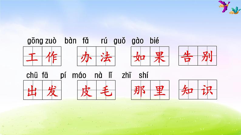 海滩(nán tān ) 帆船(fù fān ) 稻田(dà zā ) 梧桐(kǒu wú ) 北疆(cánɡ jiānɡ ) 银杏(yín ɡēn )世界(jiè tián ) 孔雀(què shěnɡ ) 麦苗(biǎ mài ) 谷粒(mǐ lì )