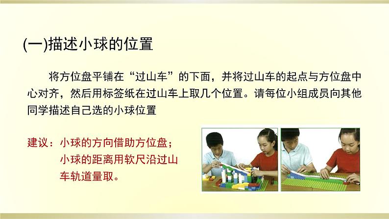 将方位盘平铺在“过山车”的下面,并将过山车的起点与方位盘中心对齐,然后用标签纸在过山车上取几个位置。请每位小组成员向其他同学描述自己选的小球位置