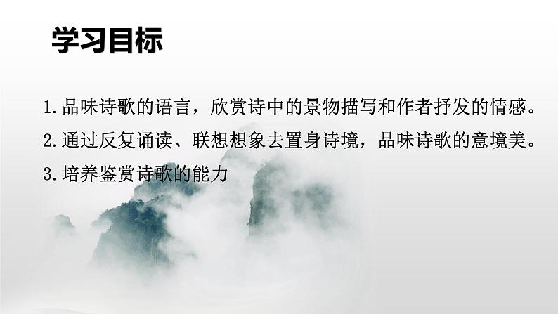 1.品味诗歌的语言,欣赏诗中的景物描写和作者抒发的情感。2.通过反复诵读、联想想象去置身诗境,品味诗歌的意境美。3.培养鉴赏诗歌的能力