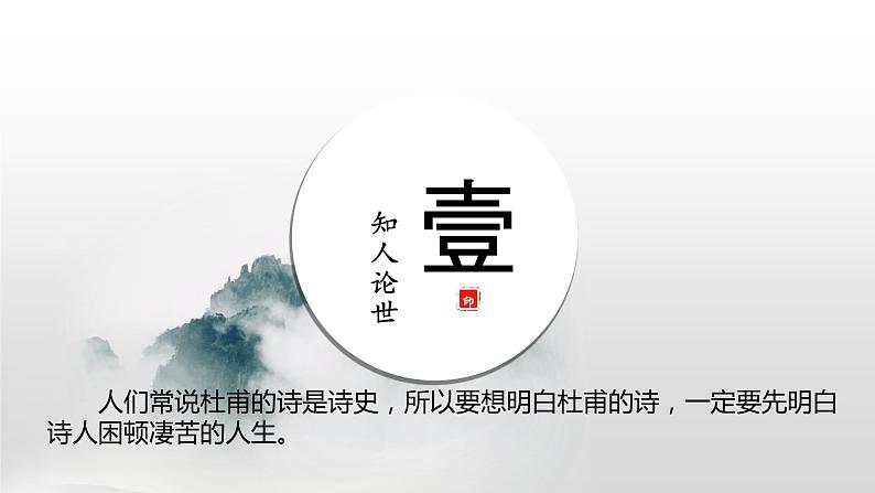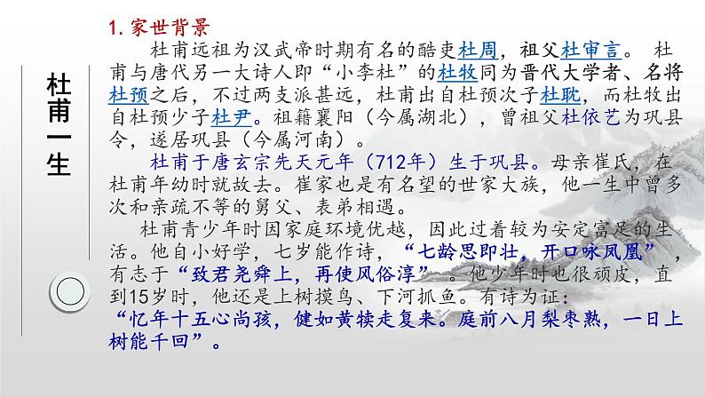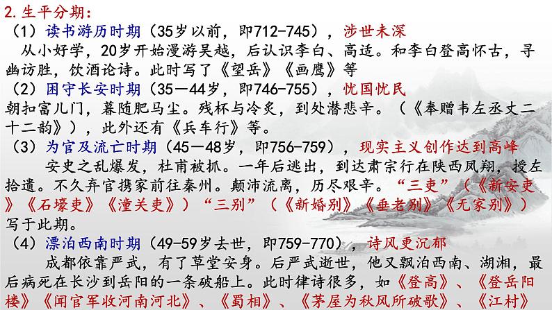 2.生平分期:(1)读书游历时期(35岁以前,即712-745),涉世未深 从小好学,20岁开始漫游吴越,后认识李白、高适。和李白登高怀古,寻幽访胜,饮酒论诗。此时写了《望岳》《画鹰》等(2)困守长安时期(35-44岁,即746-755),忧国忧民朝扣富儿门,暮随肥马尘。残杯与冷炙,到处潜悲辛。(《奉赠韦左丞丈二十二韵》),此外还有《兵车行》等。(3)为官及流亡时期(45-48岁,即756-759),现实主义创作达到高峰 安史之乱爆发,杜甫被抓。一年后逃出,到达肃宗行在陕西凤翔,授左拾遗。不久弃官携家前往秦州。颠沛流离,历尽艰辛。“三吏”(《新安吏》《石壕吏》《潼关吏》)“三别”(《新婚别》《垂老别》《无家别》)写于此期。(4)漂泊西南时期(49-59岁去世,即759-770),诗风更沉郁 成都依靠严武,有了草堂安身。后严武逝世,他又飘泊西南、湖湘,最后病死在长沙到岳阳的一条破船上。此时律诗很多,如《登高》、《登岳阳楼》《闻官军收河南河北》、《蜀相》、《茅屋为秋风所破歌》、《江村》
