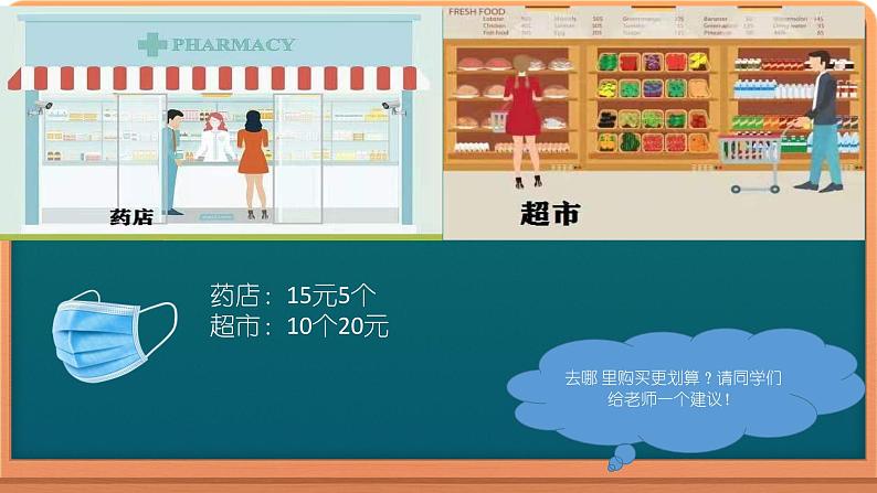 超市口罩单价:20÷10=2(元)药店口罩单价:15÷5=3(元)因为,2元