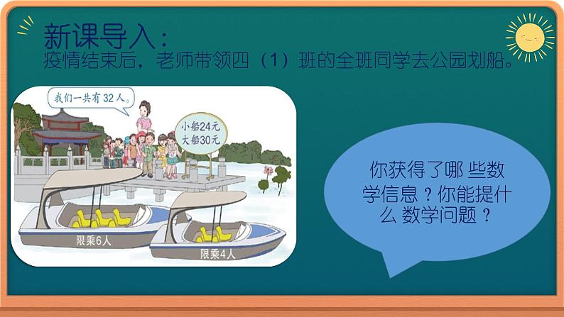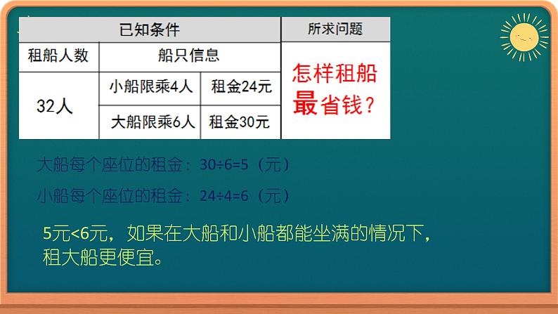 这是一份人教版四年级下册括号图片课件ppt,共18页。PPT课件主要包含了谈话导入播放歌曲,谈话导入引出课题,我们一共有32人,怎样租船最省钱呢,阅读与理解,大船人数6人条,人数32人,小船租金24元条,大船租金30元条,小船人数4人条等内容,欢迎下载使用。
