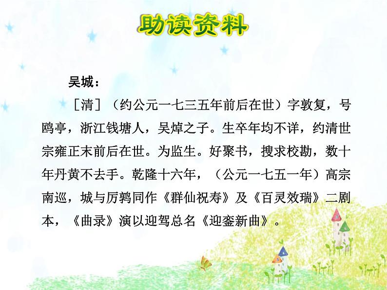 吴城:[清](约公元一七三五年前后在世)字敦复,号鸥亭,浙江钱塘人,吴焯之子。生卒年均不详,约清世宗雍正末前后在世。为监生。好聚书,搜求校勘,数十年丹黄不去手。乾隆十六年,(公元一七五一年)高宗南巡,城与厉鹑同作《群仙祝寿》及《百灵效瑞》二剧本,《曲录》演以迎驾总名《迎銮新曲》。