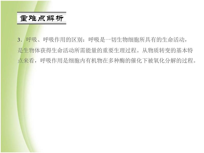 3.呼吸、呼吸作用的区别:呼吸是一切生物细胞所具有的生命活动,是生物体获得生命活动所需能量的重要生理过程。从物质转变的基本特点来看,呼吸作用是细胞内有机物在多种酶的催化下被氧化分解的过程。