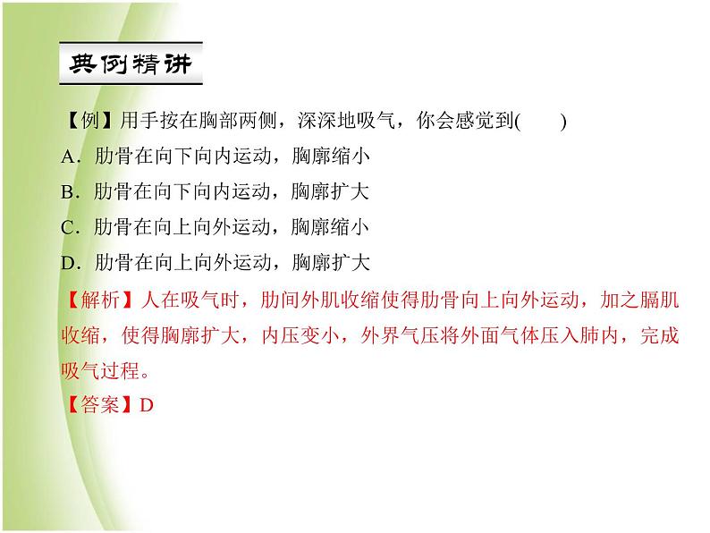 【例】用手按在胸部两侧,深深地吸气,你会感觉到( )A.肋骨在向下向内运动,胸廓缩小B.肋骨在向下向内运动,胸廓扩大C.肋骨在向上向外运动,胸廓缩小D.肋骨在向上向外运动,胸廓扩大【解析】人在吸气时,肋间外肌收缩使得肋骨向上向外运动,加之膈肌收缩,使得胸廓扩大,内压变小,外界气压将外面气体压入肺内,完成吸气过程。【答案】D