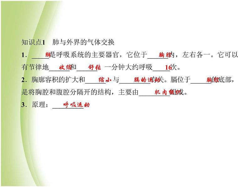 知识点1 肺与外界的气体交换1._____是呼吸系统的主要器官,它位于______内,左右各一。它可以有节律地______和______,一分钟大约呼吸_____次。2.胸廓容积的扩大和______,与_________有关。膈位于______的底部,是将胸腔和腹腔分隔开的结构,主要由_________组成。3.原理:_________。