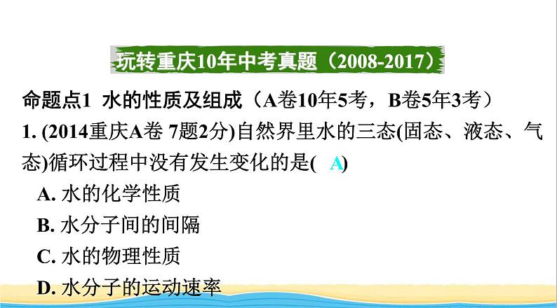 命题点1 水的性质及组成(A卷10年5考,B卷5年3考)1. (2014重庆A卷 7题2分)自然界里水的三态(固态、液态、气态)循环过程中没有发生变化的是( ) A. 水的化学性质 B. 水分子间的间隔 C. 水的物理性质 D. 水分子的运动速率