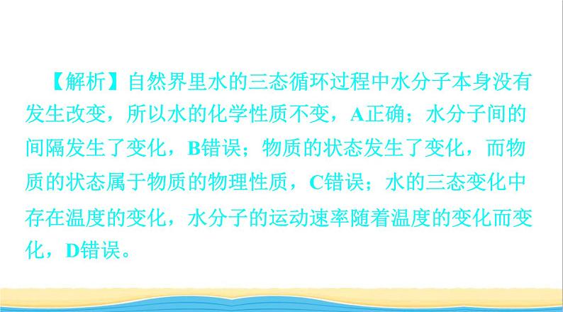 【解析】自然界里水的三态循环过程中水分子本身没有发生改变,所以水的化学性质不变,A正确;水分子间的间隔发生了变化,B错误;物质的状态发生了变化,而物质的状态属于物质的物理性质,C错误;水的三态变化中存在温度的变化,水分子的运动速率随着温度的变化而变化,D错误。