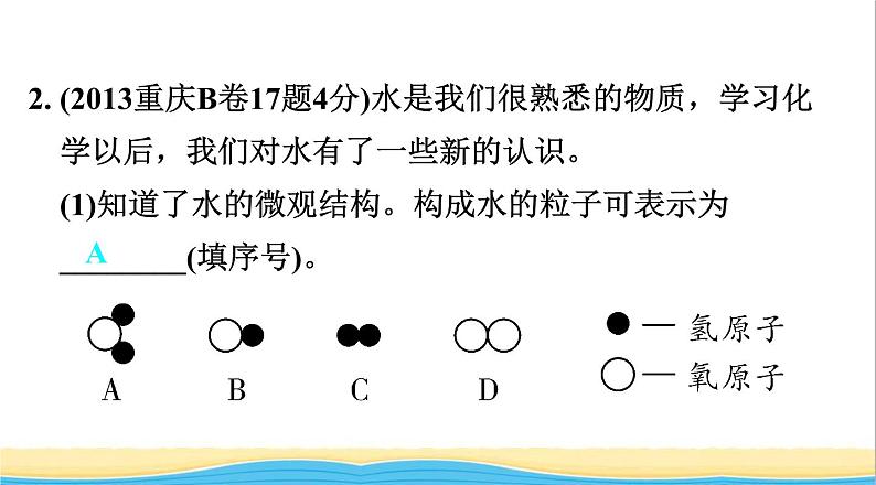 2. (2013重庆B卷17题4分)水是我们很熟悉的物质,学习化 学以后,我们对水有了一些新的认识。 (1)知道了水的微观结构。构成水的粒子可表示为 ________(填序号)。