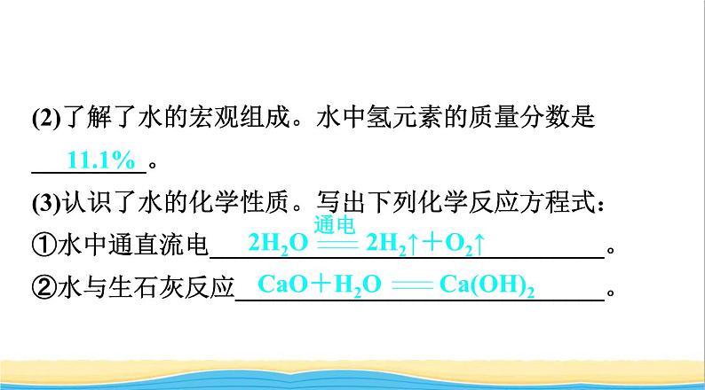 (2)了解了水的宏观组成。水中氢元素的质量分数是 _________。(3)认识了水的化学性质。写出下列化学反应方程式:①水中通直流电_______________________________。②水与生石灰反应_____________________________。