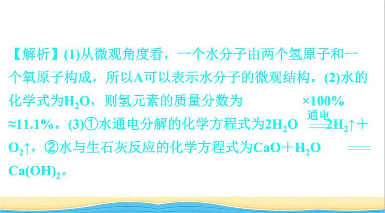 【解析】(1)从微观角度看,一个水分子由两个氢原子和一个氧原子构成,所以A可以表示水分子的微观结构。(2)水的化学式为H2O,则氢元素的质量分数为 ×100%≈11.1%。(3)①水通电分解的化学方程式为2H2O 2H2↑+O2↑,②水与生石灰反应的化学方程式为CaO+H2O Ca(OH)2。