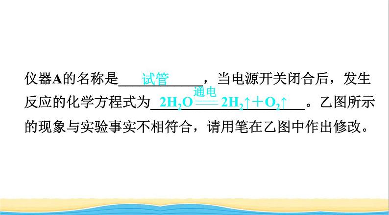 【解析】仪器A的名称是试管;图示实验是水通电分解实验,水在通电作用下产生氢气和氧气,据此写出该反应的化学方程式;通电过程中,与正极相连的试管中产生的是氧气,与负极相连的试管中产生的是氢气,且氧气与氢气的体积比为1∶2,故图乙中试管收集到的气体体积不正确,据此修改。