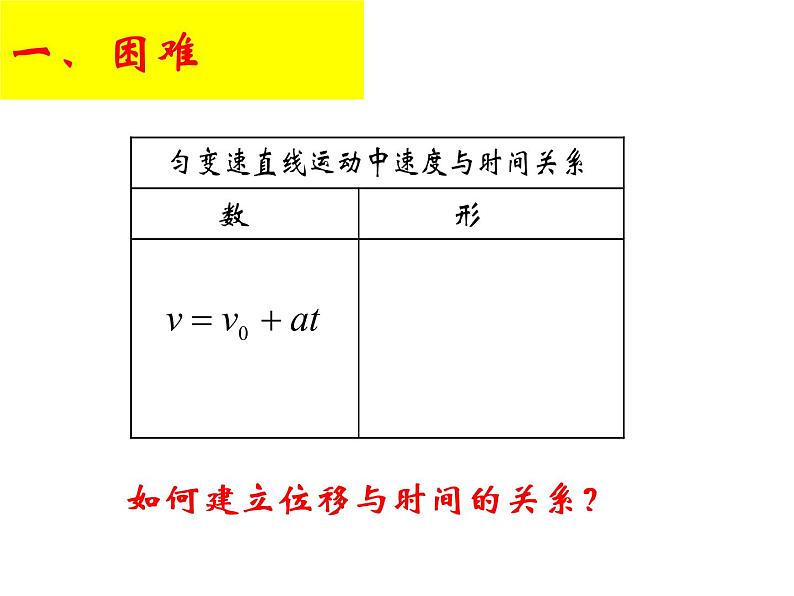 展开匀变速直线运动的位移与时间的关系实际问题一、困难二、探究二、探究二、探究二、探究━直观体会二、探究━直观体会三、探究━定量计算三、探究━定量计算三、探究━定量计算二、探究━定量计算二、探究━定量计算二、探究━“形” “数”三、对位移公式的理解小前提大前提三、对位移公式的理解四、学以致用五、小结六、作业