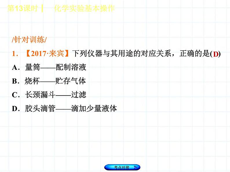 /针对训练/1.【2017·来宾】下列仪器与其用途的对应关系,正确的是( )A.量筒——配制溶液B.烧杯——贮存气体C.长颈漏斗——过滤D.胶头滴管——滴加少量液体