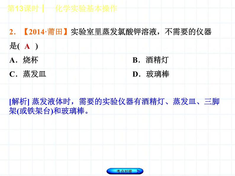 2.【2014·莆田】实验室里蒸发氯酸钾溶液,不需要的仪器是( )A.烧杯 B.酒精灯 C.蒸发皿 D.玻璃棒