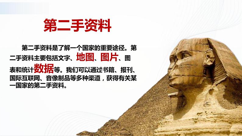 第二手资料是了解一个国家的重要途径。第二手资料主要包括文字、地图、图片、图表和统计数据等。我们可以通过书籍、报刊、国际互联网、音像制品等多种渠道,获得有关某一国家的第二手资料。