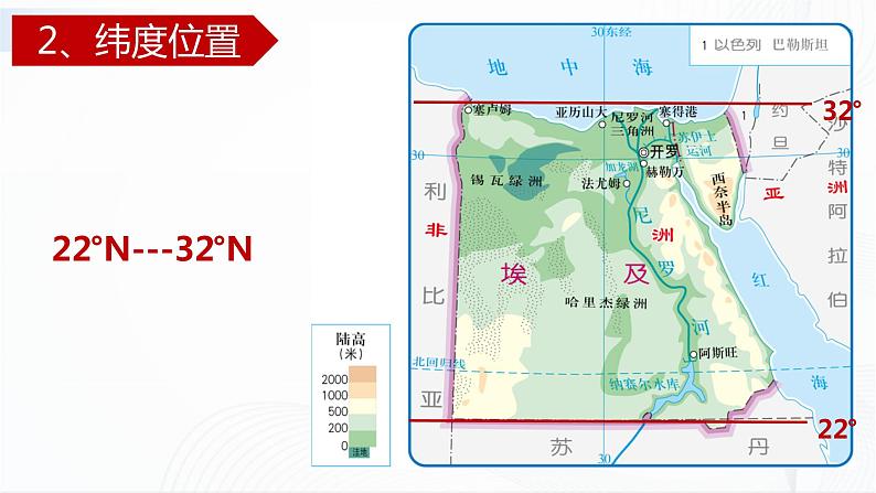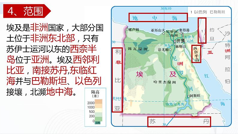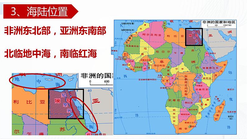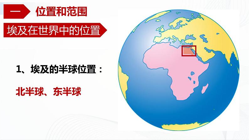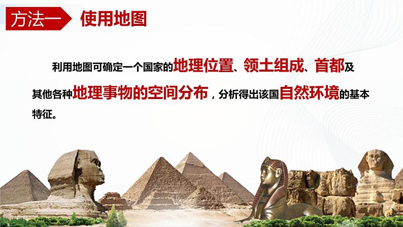 初中地理第六节 学习与探究----走进埃及备课课件ppt: 这是一份初中地理第六节 学习与探究----走进埃及备课课件ppt,共52页。PPT课件主要包含了方法一使用地图,方法二使用图片,中考直击,方法三使用数据,地图上的地理要素,一个国家的地理位置,领土组成,地理位置①半球位置,北半球,东半球等内容,欢迎下载使用。