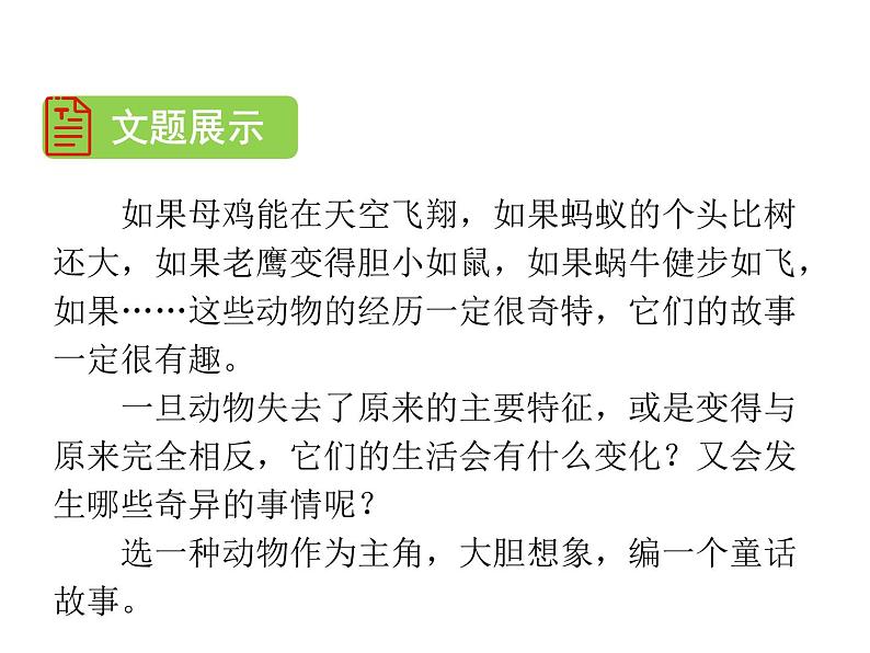 如果母鸡能在天空飞翔,如果蚂蚁的个头比树还大,如果老鹰变得胆小如鼠,如果蜗牛健步如飞,如果……这些动物的经历一定很奇特,它们的故事一定很有趣。 一旦动物失去了原来的主要特征,或是变得与原来完全相反,它们的生活会有什么变化?又会发生哪些奇异的事情呢? 选一种动物作为主角,大胆想象,编一个童话故事。