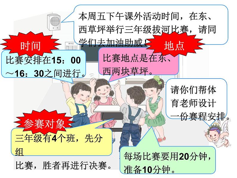 本周五下午课外活动时间,在东、西草坪举行三年级拔河比赛,请同学们去加油助威!