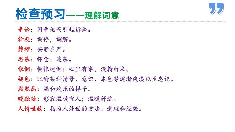 争讼:因争论而引起诉讼。斡旋:调停,调解。静穆:安静庄严。思慕:怀念;追慕。怅惘:惆怅迷惘;心里有事,没精打采。褪色:比喻某种情景、意识、本色等逐渐淡漠以至忘记。熙熙然:温和欢乐的样子。暖融融:形容温暖宜人;温暖舒适。人情世故:指为人处世的方法、道理和经验。