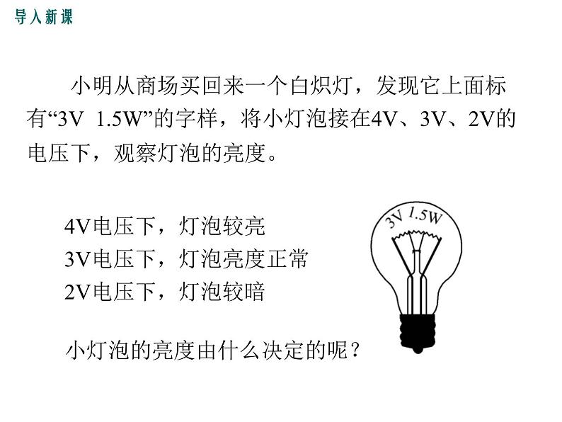 小明从商场买回来一个白炽灯,发现它上面标有“3V 1.5W”的字样,将小灯泡接在4V、3V、2V的电压下,观察灯泡的亮度。
