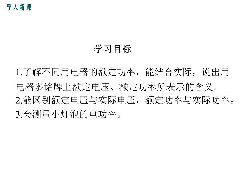 1.了解不同用电器的额定功率,能结合实际,说出用电器多铭牌上额定电压、额定功率所表示的含义。2.能区别额定电压与实际电压,额定功率与实际功率。3.会测量小灯泡的电功率。
