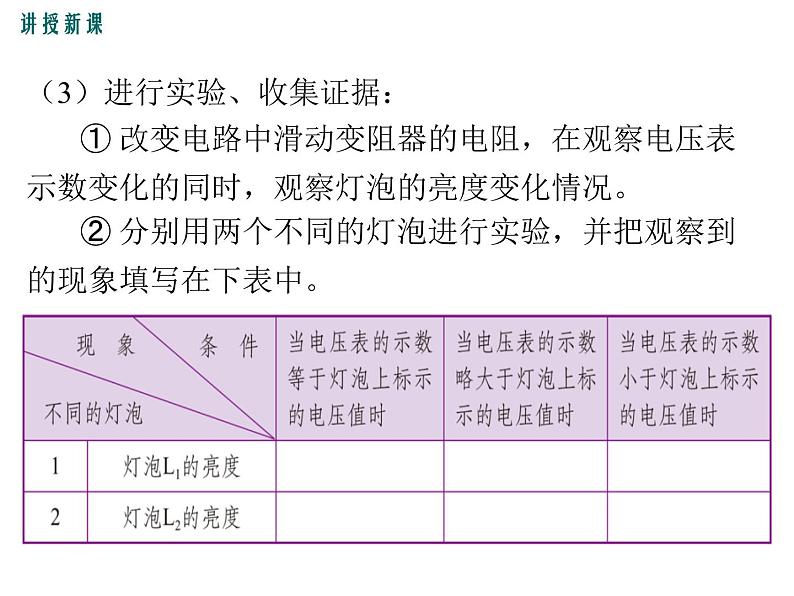 (3)进行实验、收集证据: ① 改变电路中滑动变阻器的电阻,在观察电压表示数变化的同时,观察灯泡的亮度变化情况。 ② 分别用两个不同的灯泡进行实验,并把观察到的现象填写在下表中。