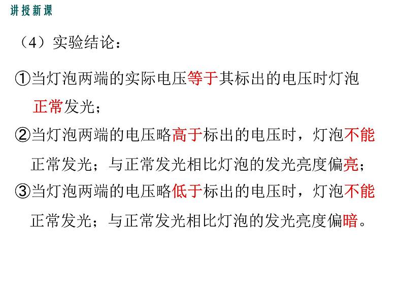 ①当灯泡两端的实际电压等于其标出的电压时灯泡 正常发光;②当灯泡两端的电压略高于标出的电压时,灯泡不能正常发光;与正常发光相比灯泡的发光亮度偏亮;③当灯泡两端的电压略低于标出的电压时,灯泡不能正常发光;与正常发光相比灯泡的发光亮度偏暗。
