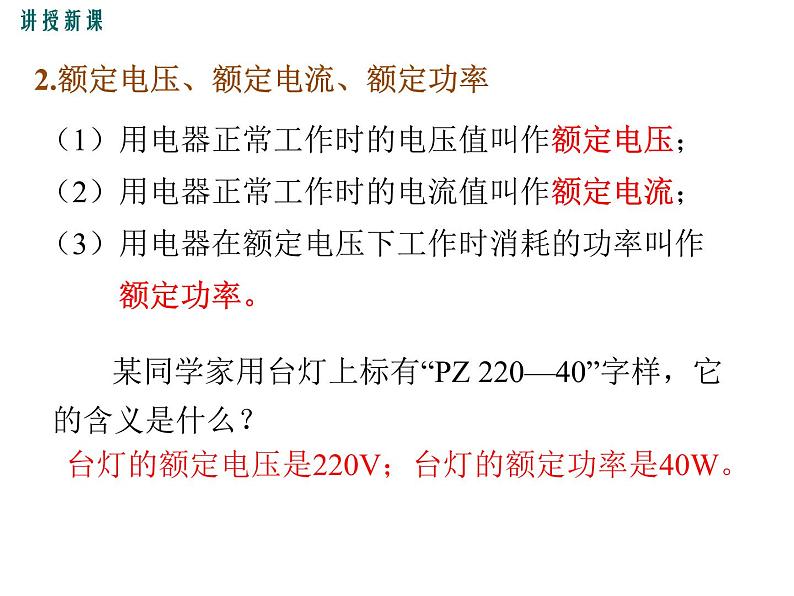 (1)用电器正常工作时的电压值叫作额定电压;(2)用电器正常工作时的电流值叫作额定电流;(3)用电器在额定电压下工作时消耗的功率叫作 额定功率。