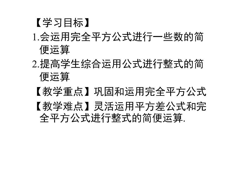 【学习目标】1.会运用完全平方公式进行一些数的简便运算2.提高学生综合运用公式进行整式的简便运算【教学重点】巩固和运用完全平方公式【教学难点】灵活运用平方差公式和完全平方公式进行整式的简便运算.