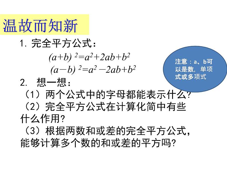 2. 想一想:(1)两个公式中的字母都能表示什么? (2)完全平方公式在计算化简中有些什么作用?(3)根据两数和或差的完全平方公式,能够计算多个数的和或差的平方吗?