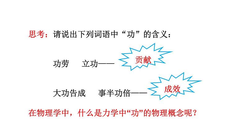 展开思考:请说出下列词语中“功”的含义: 功劳 立功—— 大功告成 事半功倍——在物理学中,什么是力学中“功”的物理概念呢?