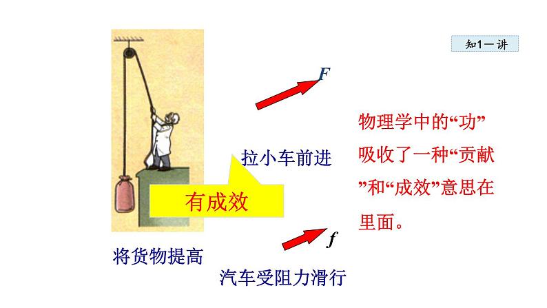 人教版八年级下册11.1 功教学课件ppt: 这是一份人教版八年级下册11.1 功教学课件ppt,共21页。PPT课件主要包含了F对小车做了功,力学中的功,马拉车,起重机吊起货物,作用在物体上的力,二者缺一不可,没有做功劳而无功,s=0,F≠0,没有做功不劳无功等内容,欢迎下载使用。