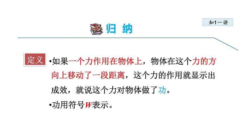 如果一个力作用在物体上,物体在这个力的方 向上移动了一段距离,这个力的作用就显示出 成效,就说这个力对物体做了功。功用符号W表示。