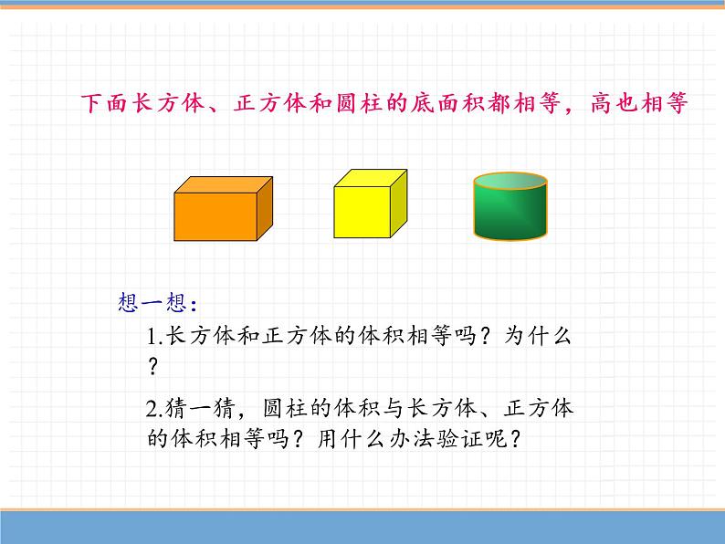 1.长方体和正方体的体积相等吗?为什么? 2.猜一猜,圆柱的体积与长方体、正方体 的体积相等吗?用什么办法验证呢?