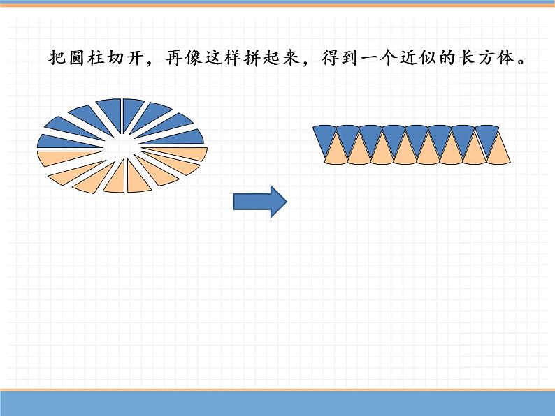 把圆柱切开,再像这样拼起来,得到一个近似的长方体。