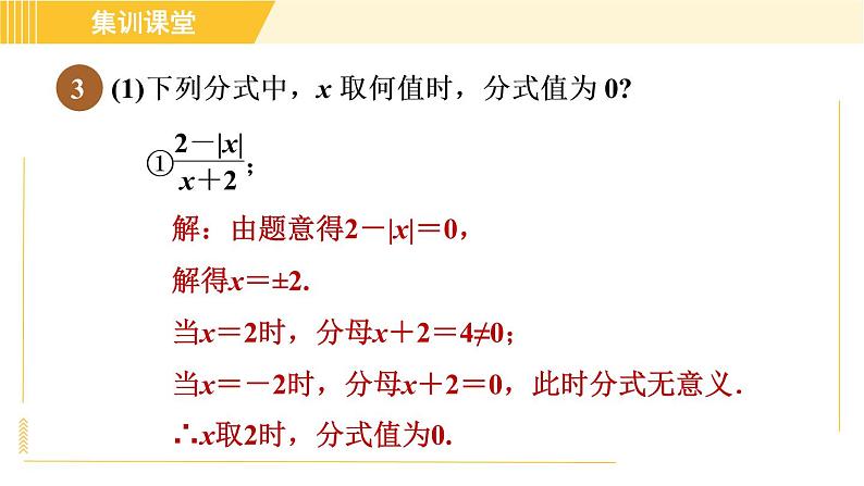 解:由题意得2-|x|=0,解得x=±2.当x=2时,分母x+2=4≠0;当x=-2时,分母x+2=0,此时分式无意义.∴x取2时,分式值为0.