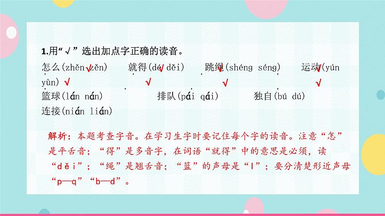 1.用“√”选出加点字正确的读音。怎么(zhěn zěn) 就得(dé děi) 跳绳(shénɡ sénɡ) 运动(yún yùn)篮球(lán nán) 排队(pái qái) 独自(bú dú) 连接(nián lián)