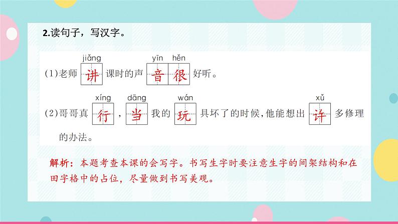 解析:本题考查本课的会写字。书写生字时要注意生字的间架结构和在田字格中的占位,尽量做到书写美观。