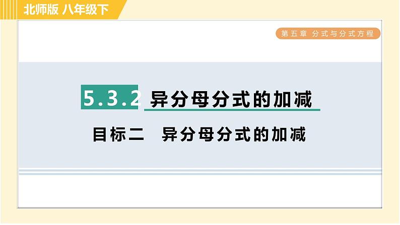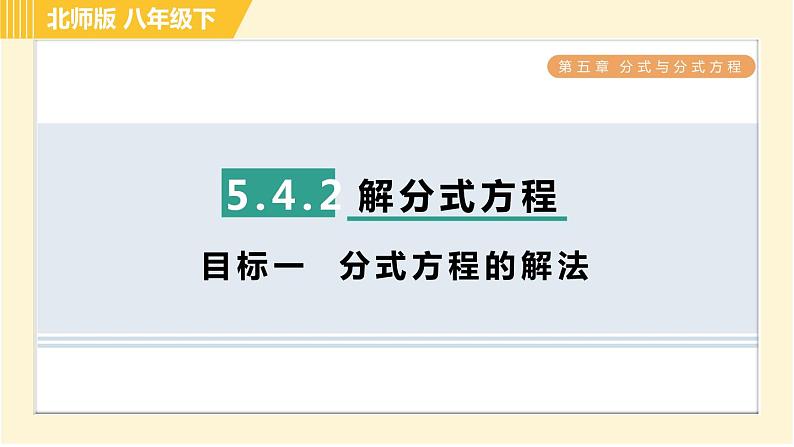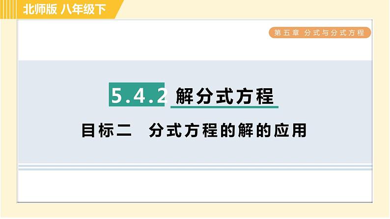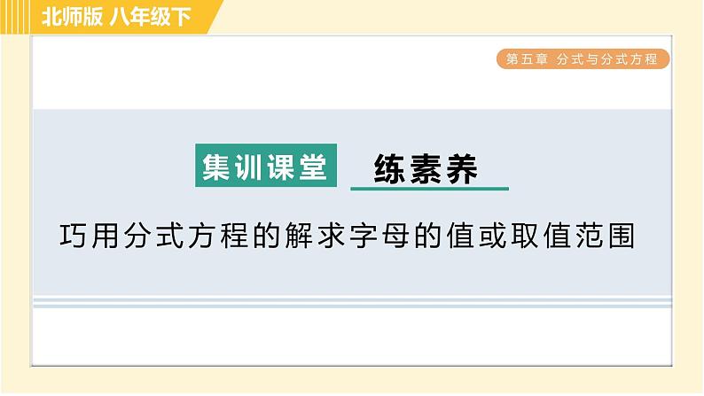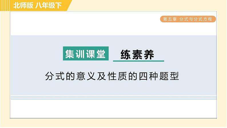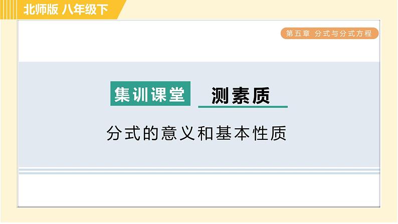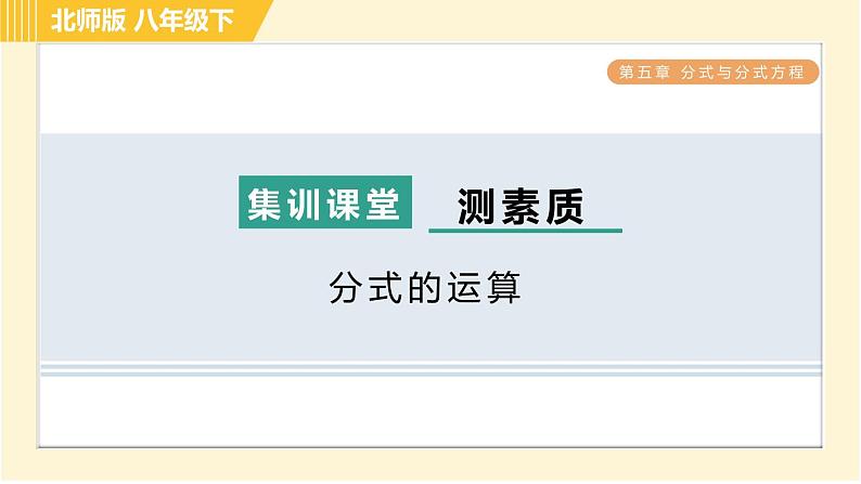 这是一份北师大版八年级下册第五章 分式与分式方程综合与测试习题ppt课件,文件包含北师版八年级下册数学第5章543分式方程的应用习题课件pptx、北师版八年级下册数学第5章集训课堂测素质分式的运算习题课件pptx、北师版八年级下册数学第5章集训课堂测素质分式方程及其应用习题课件pptx、北师版八年级下册数学第5章集训课堂测素质分式的意义和基本性质习题课件pptx、北师版八年级下册数学第5章533分式的混合运算习题课件pptx、北师版八年级下册数学第5章全章热门考点整合应用习题课件pptx、北师版八年级下册数学第5章542目标二分式方程的解的应用习题课件pptx、北师版八年级下册数学第5章集训课堂练素养2分式运算中的常用技巧与方法习题课件pptx、北师版八年级下册数学第5章集训课堂练素养1分式及其运算的九种常见题型习题课件pptx、北师版八年级下册数学第5章532目标二异分母分式的加减习题课件pptx、北师版八年级下册数学第5章511分式的定义习题课件pptx、北师版八年级下册数学第5章512目标一分式的基本性质习题课件pptx、北师版八年级下册数学第5章集训课堂练素养分式的意义及性质的四种题型习题课件pptx、北师版八年级下册数学第5章512目标二约分习题课件pptx、北师版八年级下册数学第5章531同分母分式的加减习题课件pptx、北师版八年级下册数学第5章52目标二分式的除法习题课件pptx、北师版八年级下册数学第5章532目标一通分习题课件pptx、北师版八年级下册数学第5章52目标三分式的乘方习题课件pptx、北师版八年级下册数学第5章52目标一分式的乘法习题课件pptx、北师版八年级下册数学第5章541认识分式方程习题课件pptx、北师版八年级下册数学第5章542目标一分式方程的解法习题课件pptx、北师版八年级下册数学第5章集训课堂练素养巧用分式方程的解求字母的值或取值范围习题课件pptx等22份课件配套教学资源,其中PPT共405页, 欢迎下载使用。