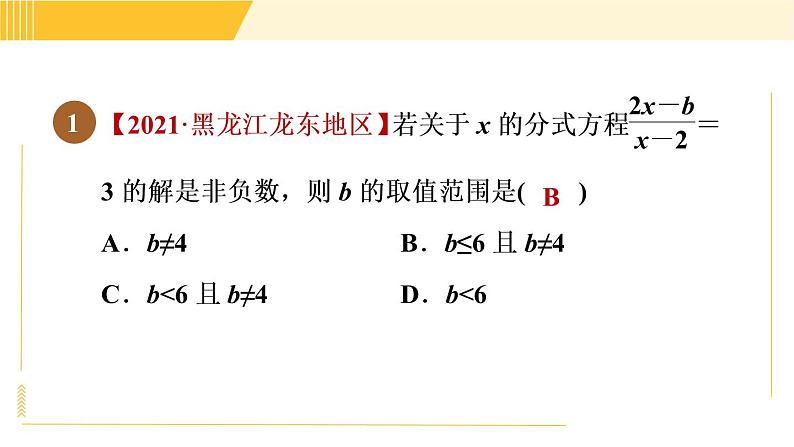 【点拨】去分母,得2x-b=3x-6,∴x=6-b.∵x≥0,∴6-b≥0,解得b≤6.又∵x-2≠0,∴x≠2,即6-b≠2,b≠4.∴b的取值范围是b≤6且b≠4.
