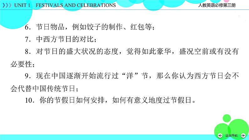 6.节日物品,例如饺子的制作、红包等;7.中西方节日的对比;8.对节日的盛大状况的态度,觉得如此豪华,盛况空前或有没有必要性;9.现在中国逐渐开始流行过“洋”节,那么你认为西方节日会不会代替中国传统节日;10.你的节假日如何安排,如何有意义地度过节假日。