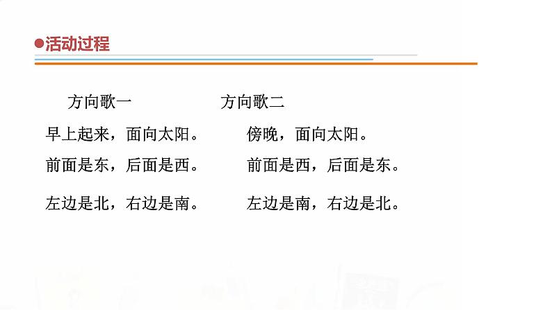 方向歌一 方向歌二 早上起来,面向太阳。 傍晚,面向太阳。 前面是东,后面是西。 前面是西,后面是东。左边是北,右边是南。 左边是南,右边是北。