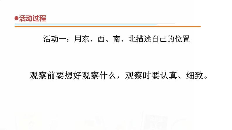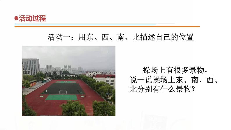 用前后左右、远近、东南西北来描述操场上的景物的位置。