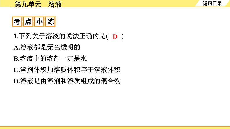 1.下列关于溶液的说法正确的是( )A.溶液都是无色透明的B.溶液中的溶剂一定是水C.溶剂体积加溶质体积等于溶液体积D.溶液是由溶剂和溶质组成的混合物