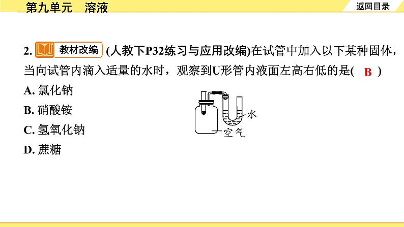 2. (人教下P32练习与应用改编)在试管中加入以下某种固体,当向试管内滴入适量的水时,观察到U形管内液面左高右低的是( )A. 氯化钠 B. 硝酸铵C. 氢氧化钠 D. 蔗糖
