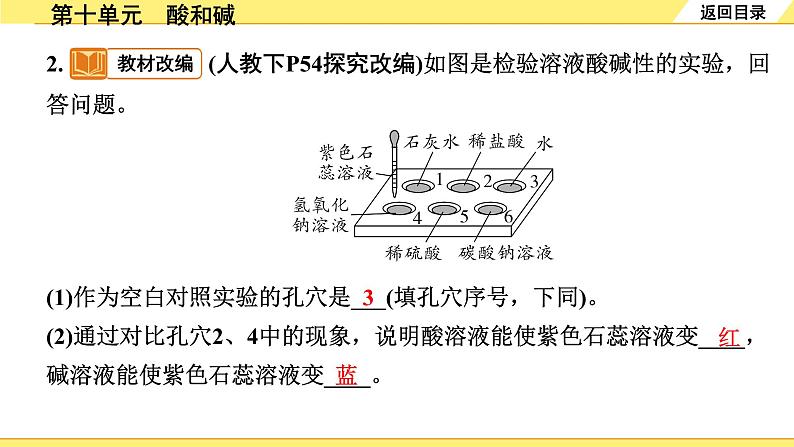 2. (人教下P54探究改编)如图是检验溶液酸碱性的实验,回答问题。(1)作为空白对照实验的孔穴是___(填孔穴序号,下同)。(2)通过对比孔穴2、4中的现象,说明酸溶液能使紫色石蕊溶液变____,碱溶液能使紫色石蕊溶液变____。