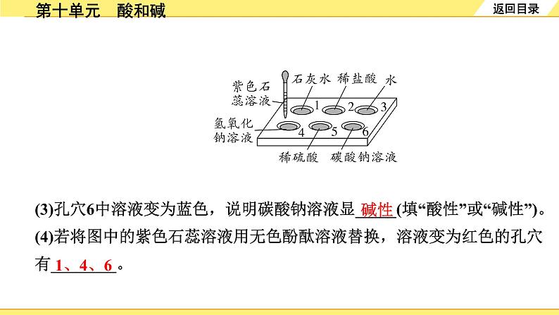 (3)孔穴6中溶液变为蓝色,说明碳酸钠溶液显_____(填“酸性”或“碱性”)。(4)若将图中的紫色石蕊溶液用无色酚酞溶液替换,溶液变为红色的孔穴有________。