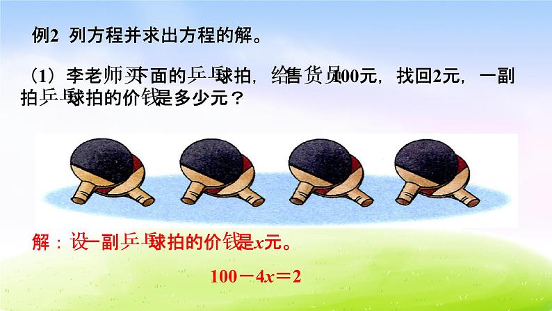 (1)李老师买下面的乒乓球拍,给售货员100元,找回2元,一副拍乒乓球拍的价钱是多少元?