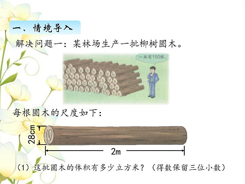 这是一份小学冀教版木材加工问题优秀课件ppt,共17页。PPT课件主要包含了情境导入,横断面是圆形,探索新知,每根圆木的尺寸如下,28m,一根圆木的体积,横断面是正方形,每根方木的体积,课堂练习,米20分米等内容,欢迎下载使用。